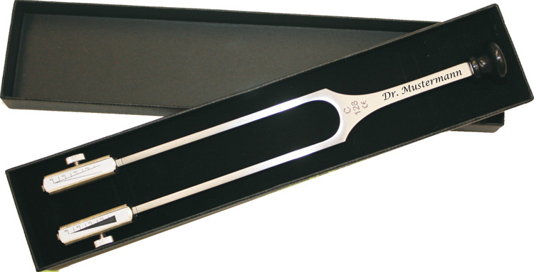 ♦ Neurologische Stimmgabel nach Rydel-Seiffer ♦ Ausführung in Edelstahl ♦ c 128 Hz/C 64 Hz ♦ mit abnehmbaren Dämpfern und Kunststoff-Fuß ♦ für neurologische Untersuchungen und Sensibilitätstest bei Neuropathie ♦ Gewicht ca. 130 g ♦ Maße (L/B): 230 x 50 mm ♦ Individuelle Lasergravur ♦ Elegante Geschenkverpackung in schiefergrau